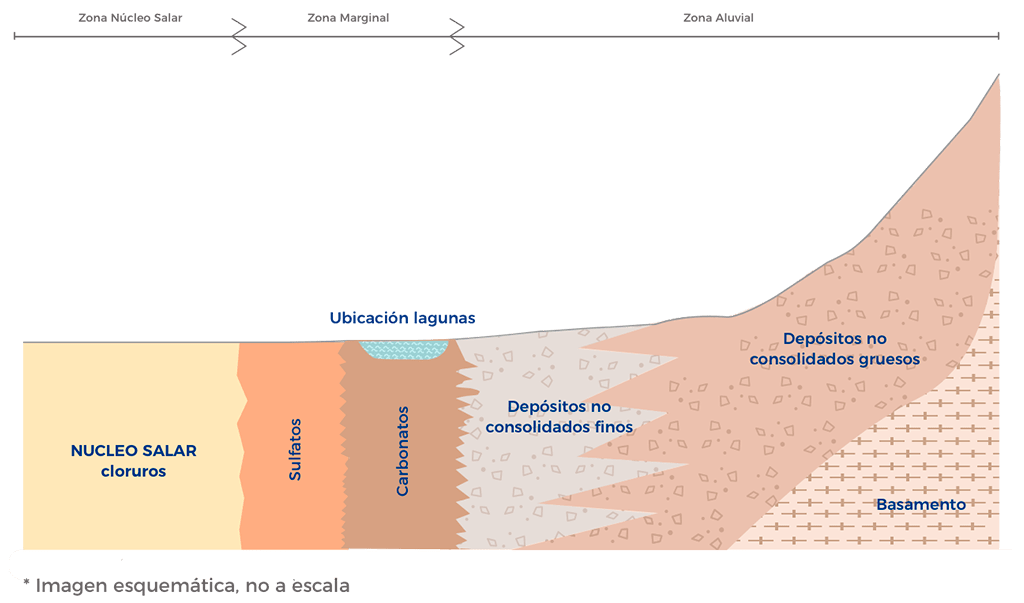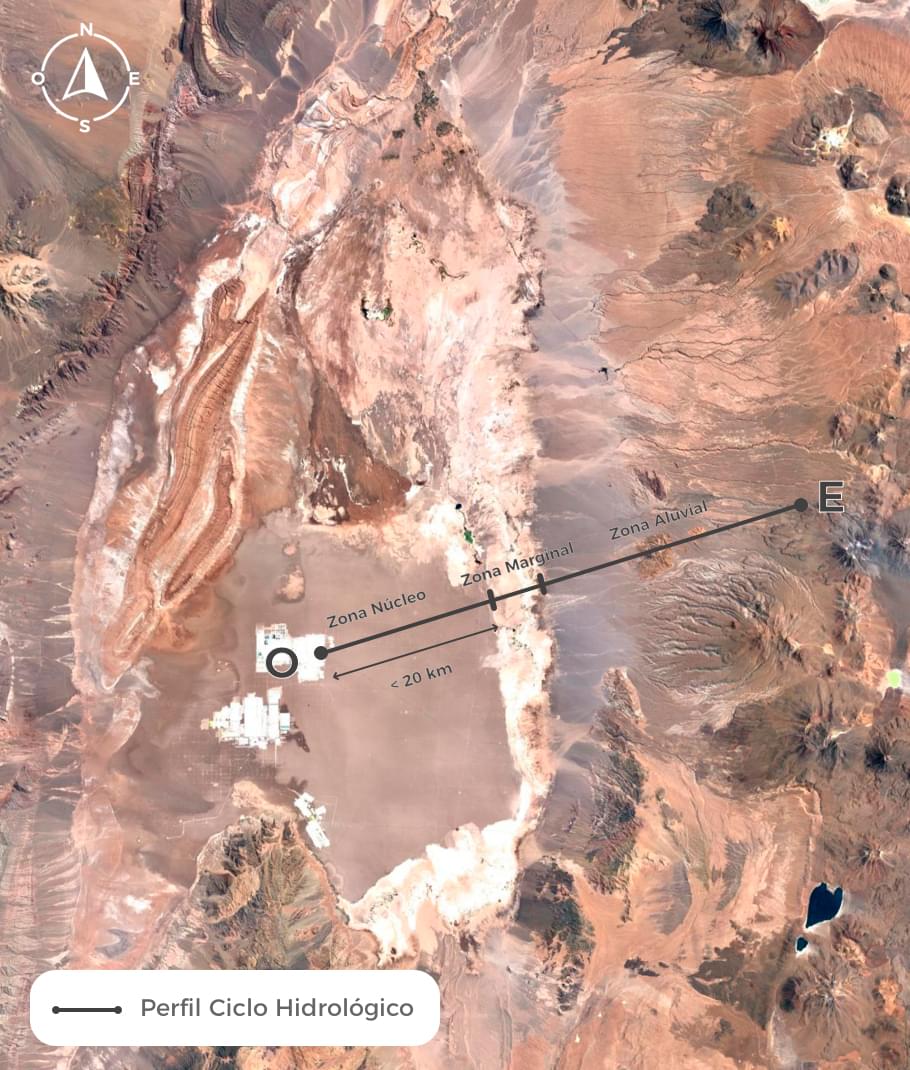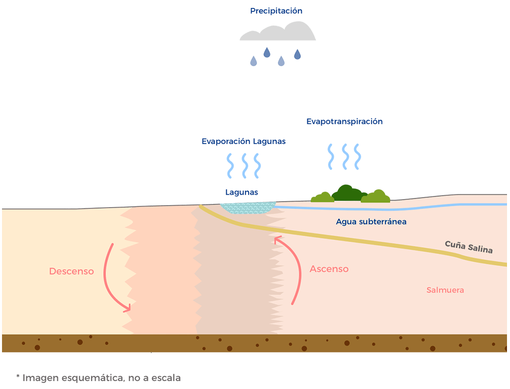 En la cuenca del Salar de Atacama existen dos tipos de fluidos: la salmuera y el agua dulce. La salmuera es un líquido muy denso, con alta salinidad (¡es 7 veces más salada que el agua del mar!), que se encuentra exclusivamente en los reservorios localizados bajo la superficie del núcleo del Salar, mientras que el agua dulce se observa en los acuíferos de la Planicie Aluvial. Cuando ambos fluidos entran en contacto, su gran diferencia de densidad hace que el agua dulce fluya por encima de la salmuera, formando una interfaz o cuña salina entre ambos. Como el agua dulce se mueve por encima de la salmuera, al llegar a las cercanías del núcleo del Salar no tiene otro camino que salir a la superficie, formando pequeños lagos y canales que se observan en la superficie de la Zona Marginal. Este proceso dinámico es el que permite la existencia de la vegetación que hoy en día observamos en los alrededores del Salar.