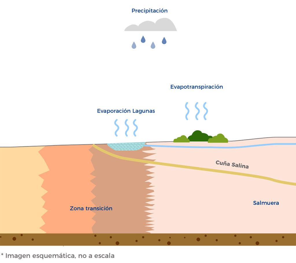 El sistema pierde agua a través de la evaporación y la evapotranspiración. La evaporación se produce desde la superficie de las lagunas y desde el agua subterránea, donde su magnitud depende de la profundidad a la que se encuentre la napa, evaporando más en las zonas donde el agua esté más cerca de la superficie. En el caso del núcleo, la costra salina presente en la superficie dificulta la evaporación desde el agua subterránea. Además, es importante señalar que la evaporación depende de la salinidad del agua: a mayor salinidad (y densidad) se produce menor evaporación.