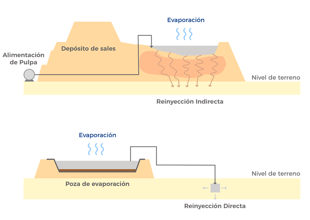 Parte del volumen de salmuera remanente de la precipitación de sales y que no es utilizada para la producción de litio (salmuera no usada) es restituida al Salar mediante el proceso de reinyección. De acuerdo a la RCA 226/2006, existen dos tipos de reinyección de esta salmuera no usada: (1) reinyección directa, en la cual la salmuera es devuelta al salar directamente en una ubicación determinada y la (ii) reinyección indirecta, en la cual una pulpa de salmuera es enviada a los acopios de sales, en la cual se produce la infiltración de parte líquida de la pulpa y se cuantifica su ingreso al salar.