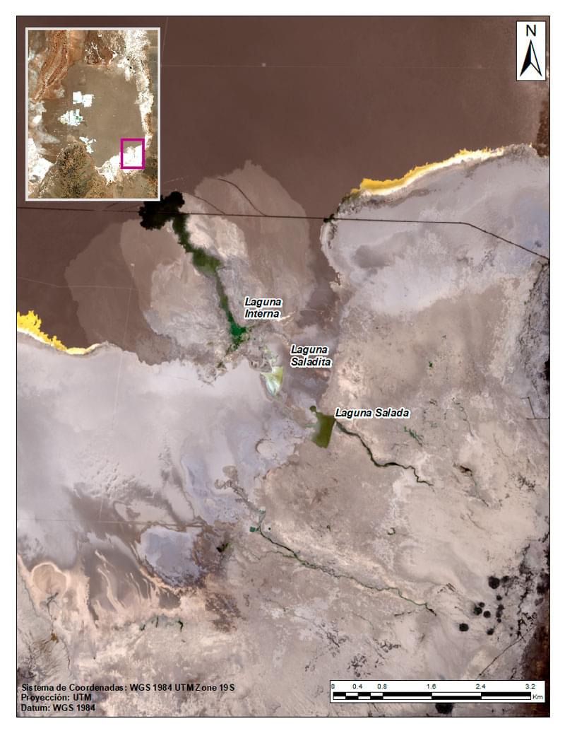 Este sistema se encuentra al Sur Este del núcleo del Salar de Atacama, a 25 km de la zona productiva de SQM Salar, cercano al Poblado Peine. Incluye las lagunas Salada, Saladita e Interna, las cuales representan, en importancia, el segundo sector reproductivo de flamencos en el Salar de Atacama. En épocas de abundancia hídrica se producen desbordes desde la laguna Saladita, formando la laguna Interna.